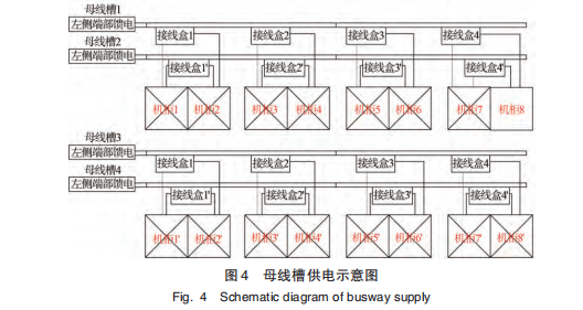 端部饋電模塊由每一列機柜對應的主備供母線槽各配置1個接入配電盒,與主干母線槽的插接箱間采用電纜連接。