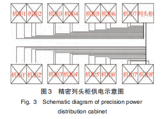 計劃2:假如選用傳統的精細列頭柜配電計劃,則需為兩列機柜配置 1個精細列頭柜,并向每面機柜提供雙電源供電。如圖3所示。