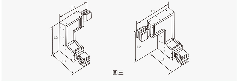 變?nèi)菽妇€主要用于同一系統(tǒng)中不同額定電流單元的連接,以使整個母線槽系統(tǒng)更加經(jīng)濟(jì)實(shí)用。其標(biāo)準(zhǔn)長度為1000mm,也可根據(jù)用戶要求定制尺寸。見圖六